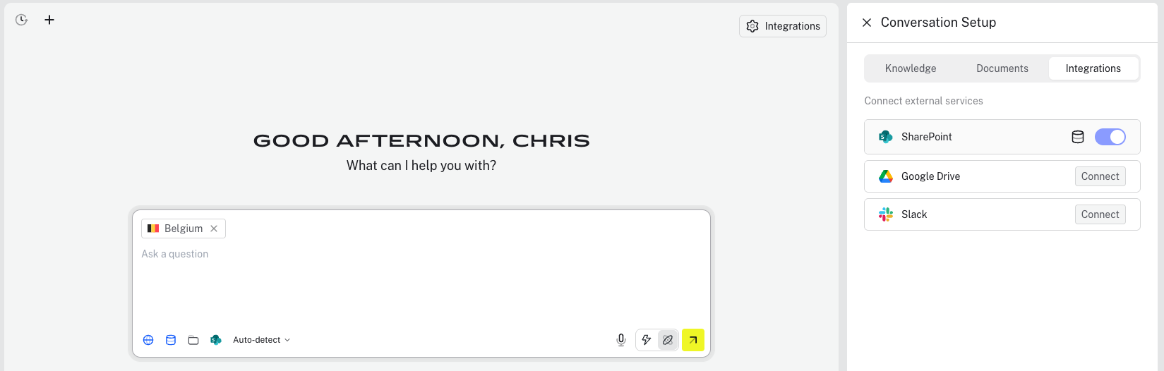- In the Integrations section, click the "Connect" button next to SharePoint